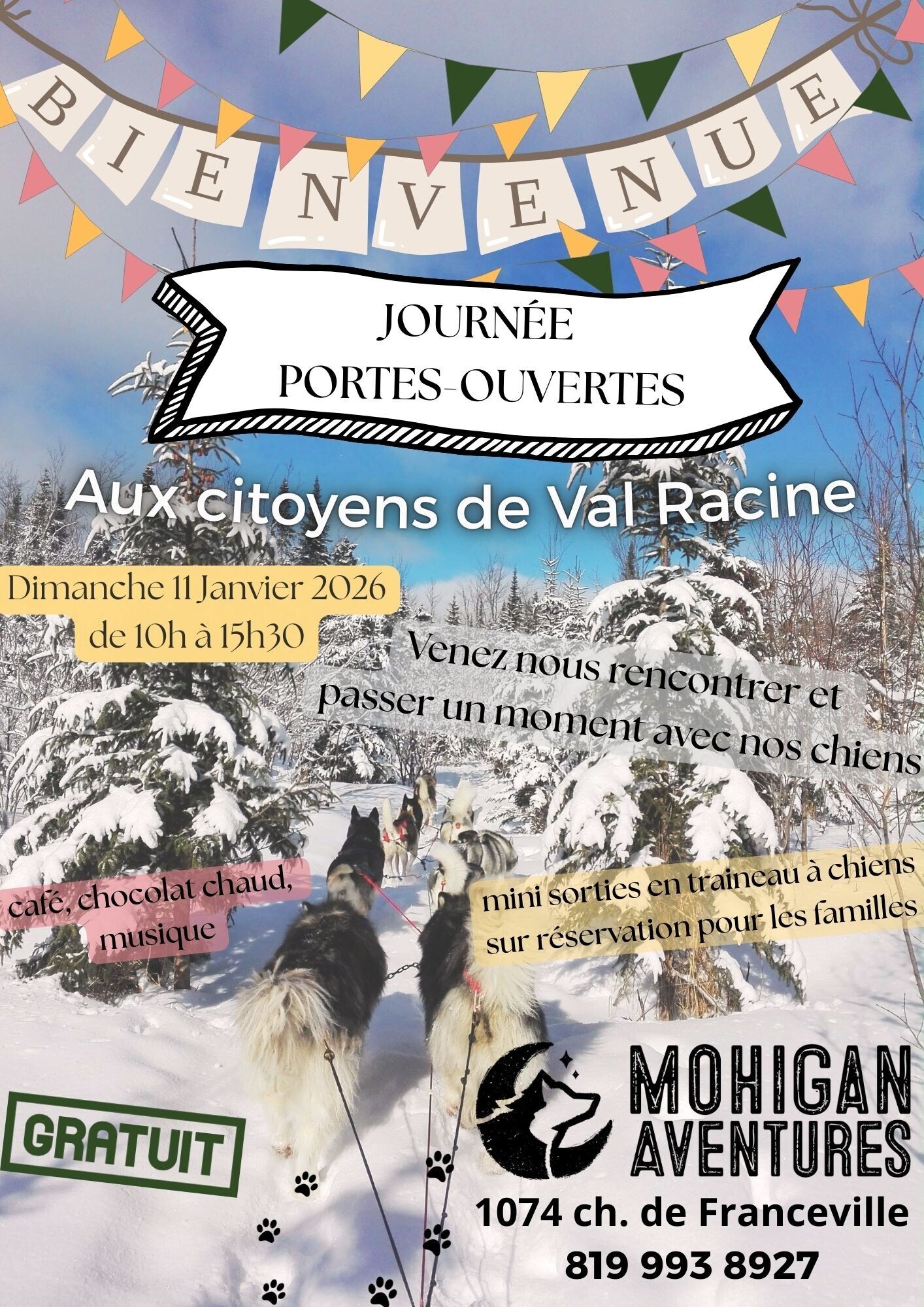 Venez rencontrer et passer un bon moment avec nos chiens le dimanche 11 janvier 2026 de 10h à 15h30, au 1074 chemin de Franceville à Val-Racine.