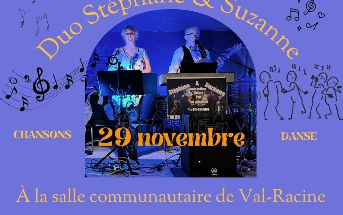 Le comité des Dynamiques invite toute la population à venir entendre le duo Stéphane et Suzanne à la salle communautaire de Val-Racine le samedi 29 novembre à partir de 19h.