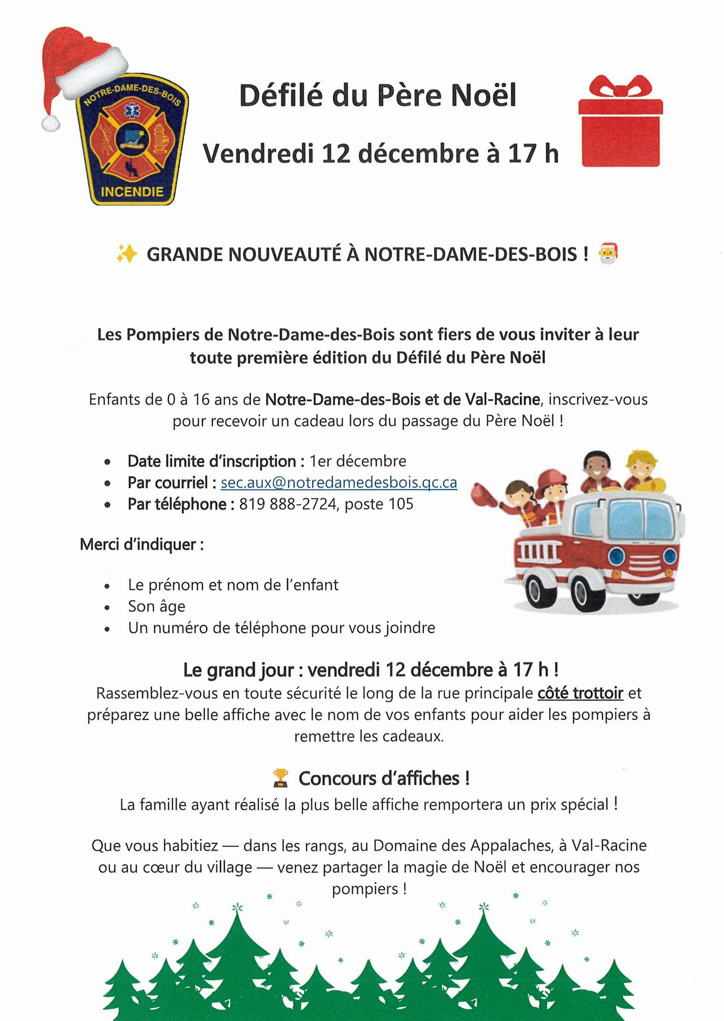 Les enfants de 0 à 16 ans de Notre-Dame-des-Bois et de Val-Racine peuvent s'inscrire pour recevoir un cadeau lors du passage du Père Noël.