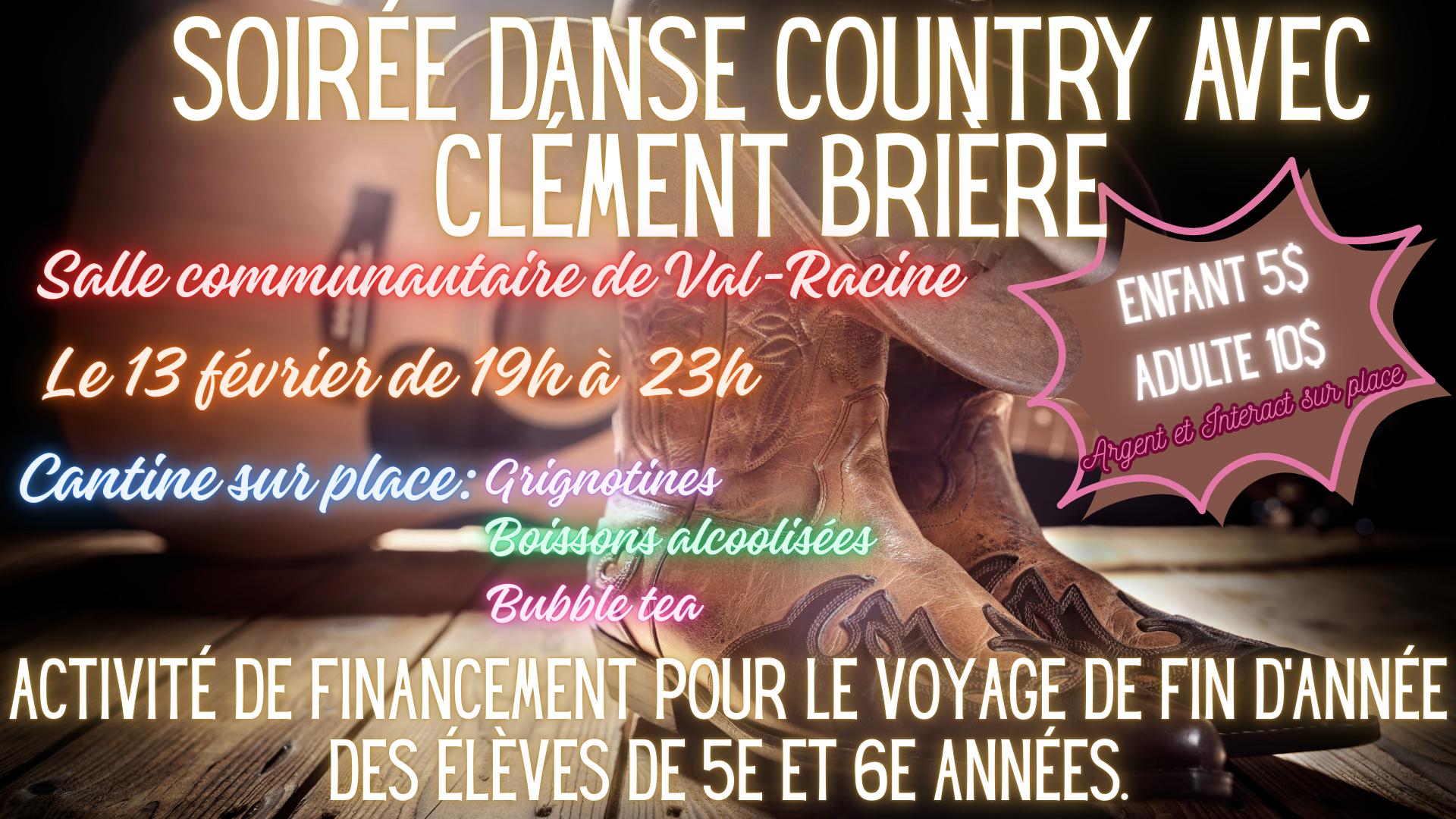 Une activité de financement DANSE COUNTRY aura lieu à la salle communautaire de Val-Racine pour amasser des fonds afin de permettre aux élèves de 5e et 6e années de faire leur voyage de fin d'année